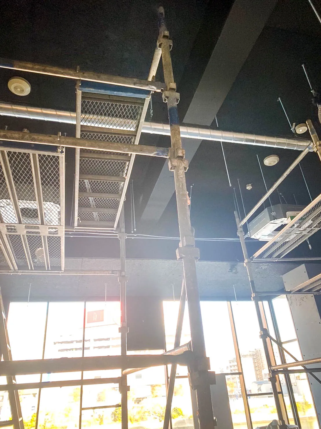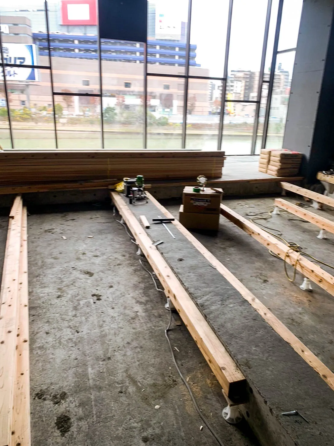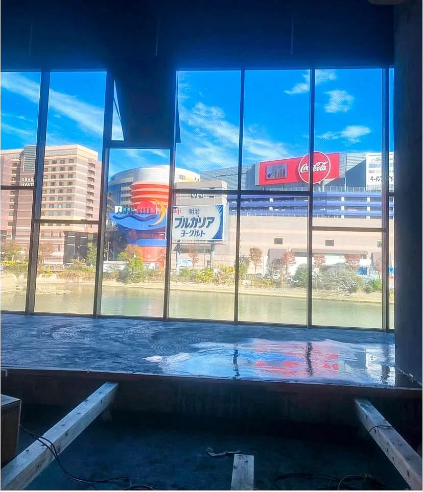 天井が高く、壁一面が窓で、ロケーションが良いテナントだったので、施主様との打合せを重ね、広い空間からの外の景色を活用した施工を致しました。